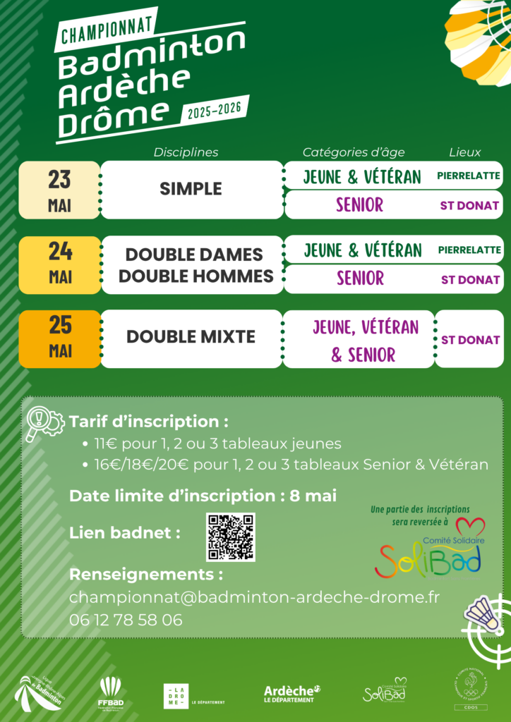 Comme chaque année le Comité Drôme Ardèche de Badminton organise un Championnat, cette année il a lieu lors du week-end de Pentecôte (du samedi 23 au lundi 25 mai).