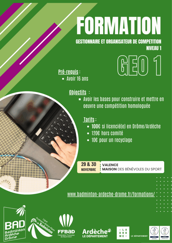Le Comité Drôme-Ardèche de Badminton organise une session de formation de Gestionnaire et Organisateur de Compétitions niveau 1 (GEO1), les 29 et 30 novembre 2025 à la Maison des bénévoles du sport, 71 rue Latécoère à Valence.